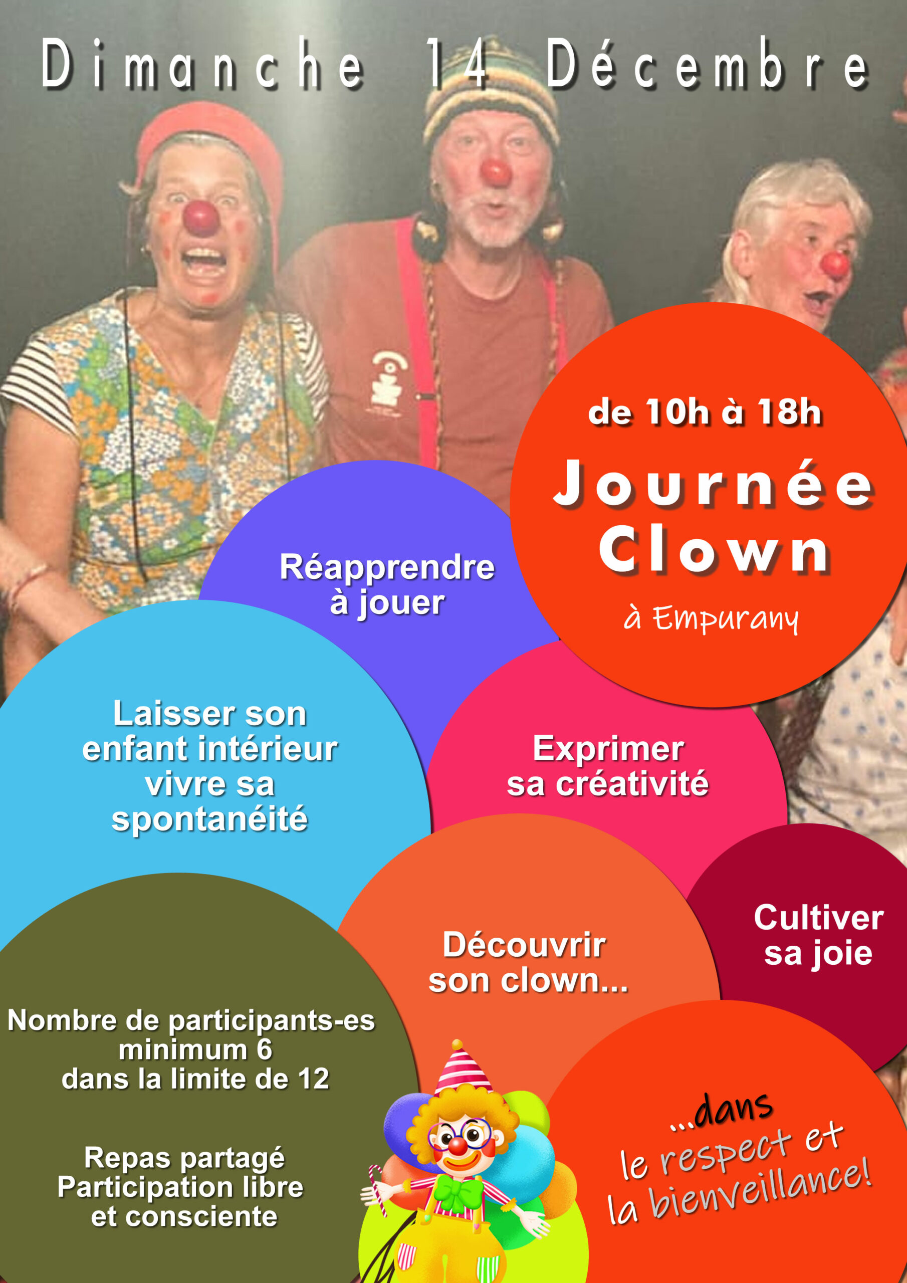 Journée Clown le 14 Décembre 2025 Cette journée vous invite à découvrir votre Clown, partager le plaisir de jouer sur scène, seul, en duo, trio… Laisser son enfant intérieur vivre sa spontanéïté, prendre confiance en soi, être en empathie et exprimer sa créativité. Dimanche 14 Décembre 2025 de 10h à 18h00 à Empurany. Nombre de participants-es minimum 6, dans la limite de 12. Repas partagé. Participation libre et consciente. Pour tous renseignements et réservation contactez-nous